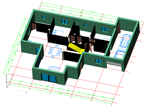 A partir del plan 2D terminado, la elevación y la sección se pueden generar con unos pocos clics. Componga pisos, paredes, puertas, escaleras y techos del plano 2D.